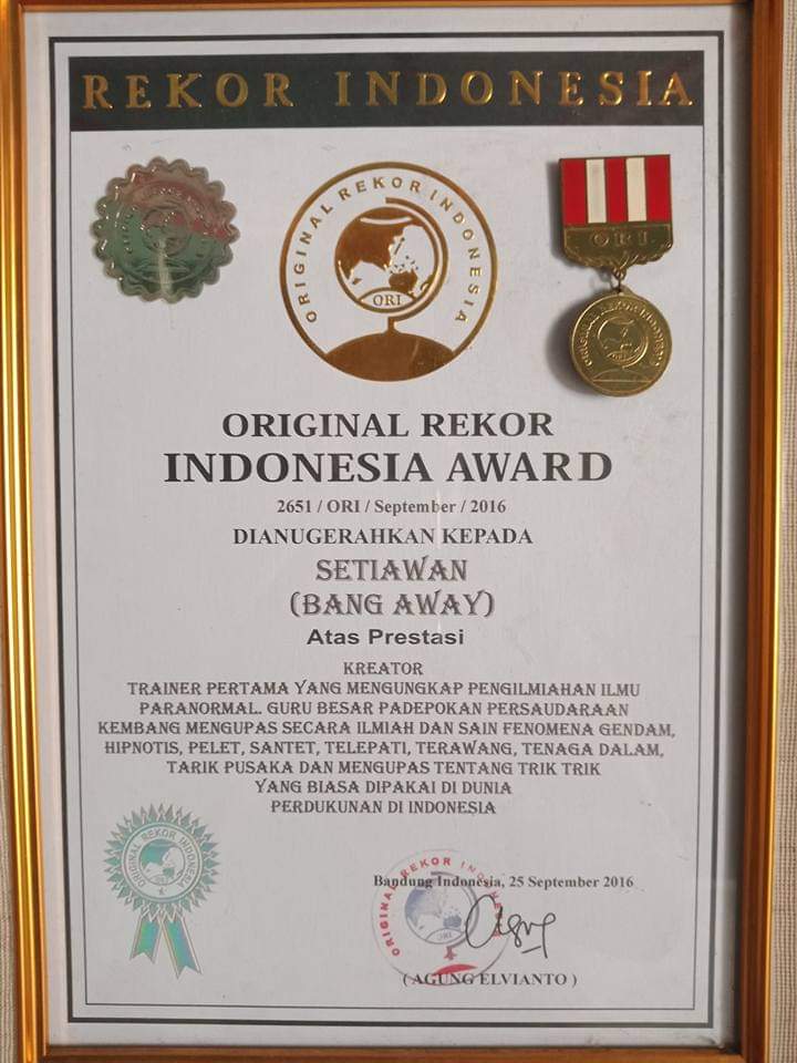 Setiawan (Bang Away) dianugerahi Original Rekor Indonesia Award sebagai “Kreator dan Trainer pertama yang mengungkap pengilmiahan ilmu paranormal”.