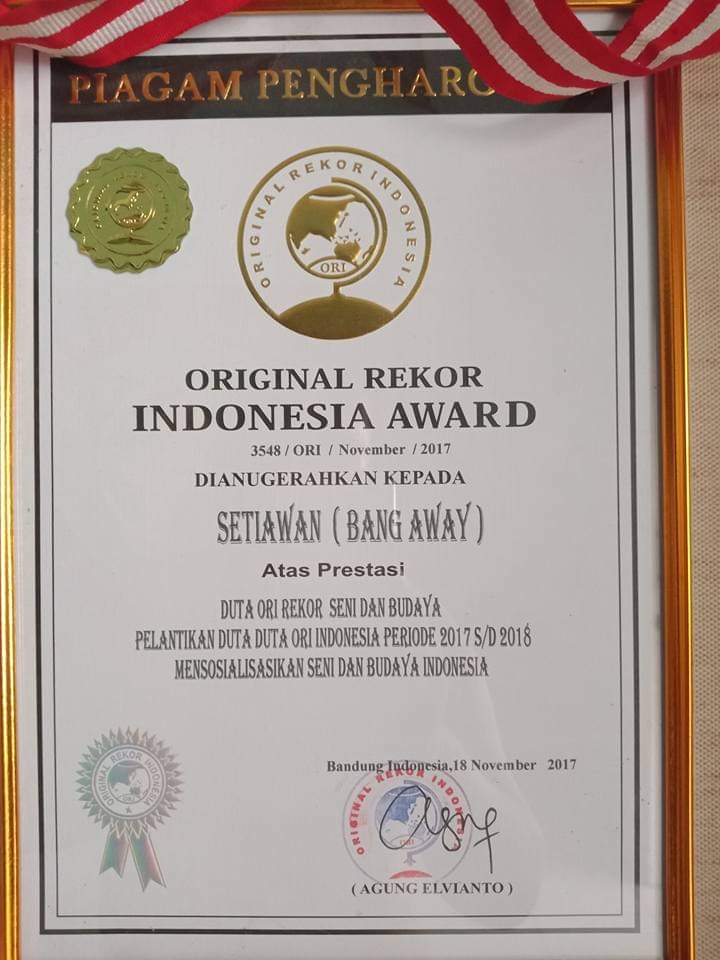 Setiawan (Bang Away) dianugerahi Original Rekor Indonesia Award sebagai Duta ORI Rekor Seni dan Budaya Indonesia.