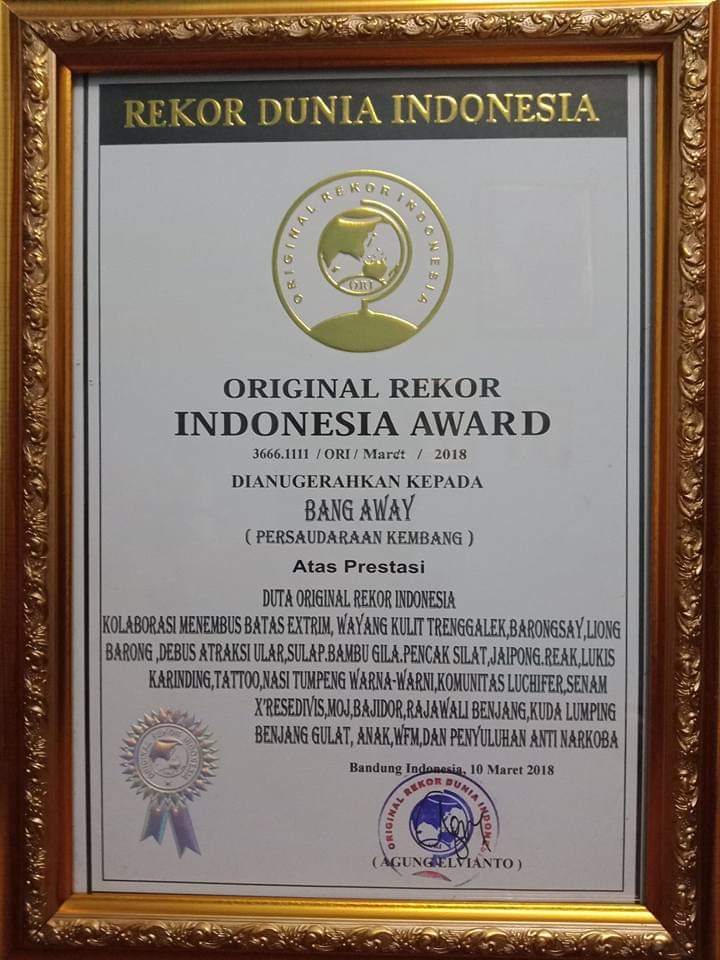 Bang Away dianugerahi Original Rekor Indonesia Award sebagai Duta Original Rekor Indonesia.