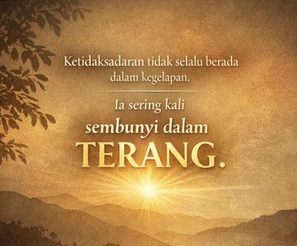 •• Sadari ketidaksadaran diri bukan ajakan untuk mencari kesalahan, melainkan undangan untuk melihat lebih jujur ke dalam diri. Sebab ketidaksadaran tidak selalu hadir dalam kebodohan atau kegelapan; ia justru sering sembunyi dalam terang—dalam keyakinan bahwa kita sudah tahu, sudah paham, dan sudah benar. Di sanalah refleksi menjadi penting: ketika kesadaran tidak dibangun dari klaim kebenaran, tetapi dari keberanian untuk mengamati diri sendiri secara perlahan, tenang, dan bertanggung jawab.